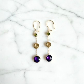 The design begins with a vibrant Peridot at the top, followed by a warm, honey-hued Citrine, and culminates in a deep, regal Amethyst drop. Each stone is meticulously bezel-set to maximize light exposure, ensuring a brilliant sparkle with every movement.