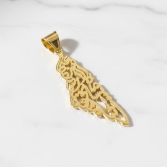 18K gold pendant featuring the Map of Palestine and custom Arabic calligraphy of Mahmoud Darwish’s line: “We have on this land all of that which makes life worth living.”