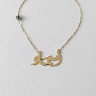 Personalize your protection with our 18K Gold Arabic Name Evil Eye Necklace. This exquisite piece features a custom Arabic name pendant (2.5-3 cm) with an evil eye charm, combining beautiful calligraphy with ancient symbolism. The standard chain length is 40-42 cm. You can add length to the necklace for an additional charge.