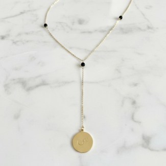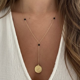 Crafted in 18K gold, this sophisticated lariat necklace blends the bold contrast of black onyx with a handcrafted coin pendant. Personalize yours with a meaningful verse or favorite saying to create a modern heirloom that carries your message close to your heart.