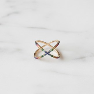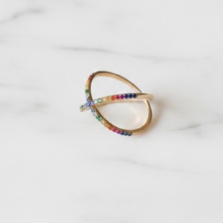 The Rainbow X Ring is a stunning 18K gold piece featuring gracefully crossed bands forming an elegant X shape, pavé-set with a vibrant rainbow of multicolored gemstones that sparkle with every move. Customizable and full of joyful energy, it symbolizes connection and endless possibilities in a delicate, modern design.