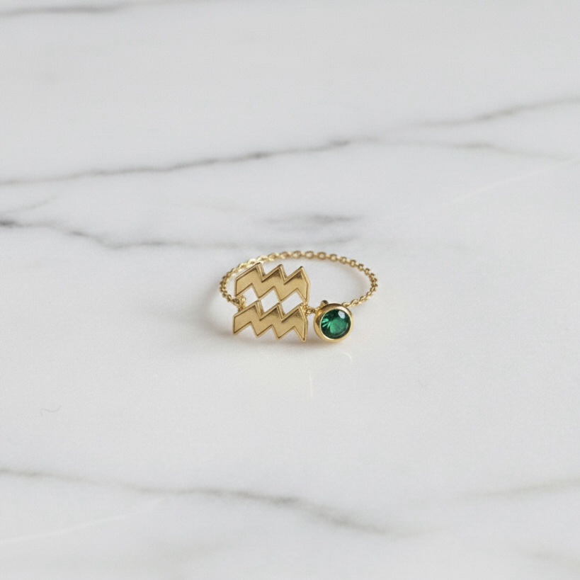 Crafted with 18K Gold and your favorite gemstone, this Horoscope sign chain ring is the perfect way to represent your star sign or gift your favorite Aquarius.
