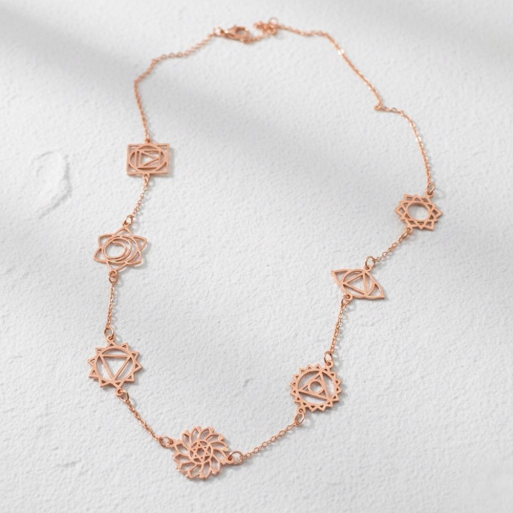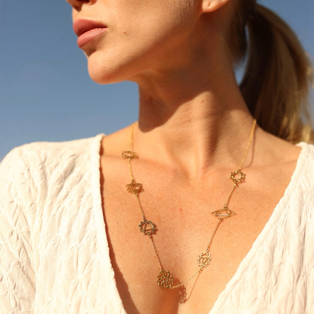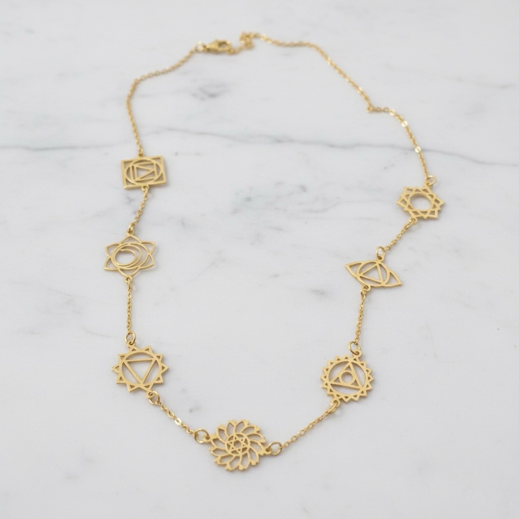 Elevate your look with our exquisite 7 Chakra Necklace, crafted from luxurious 18K Gold.