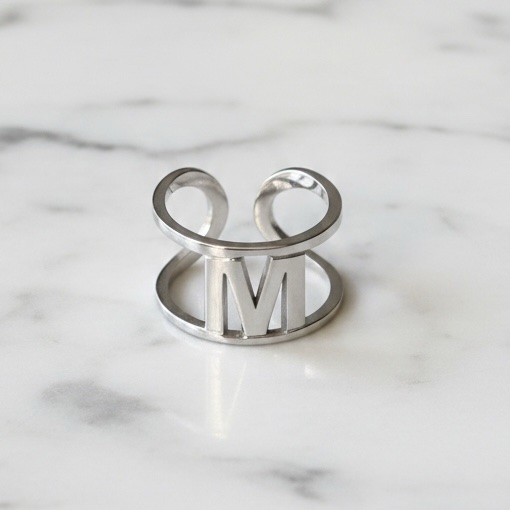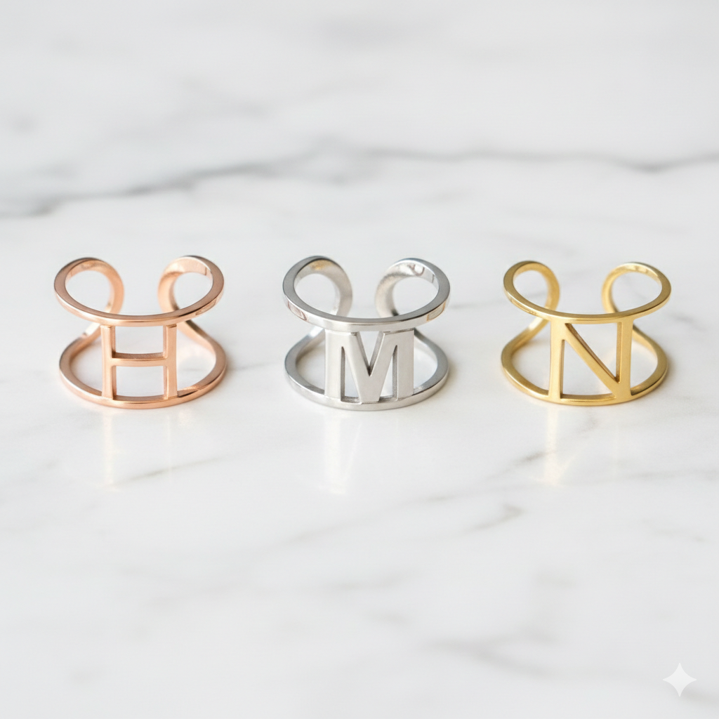 The Forever Personal Cut-Out Ring Keep your most cherished stories close to hand. This bespoke 18K gold ring features your chosen letters elegantly laser-cut into the band, turning a simple accessory into a lifelong keepsake. Designed with a sophisticated open-ended silhouette, it adjusts effortlessly for a perfect fit on any finger. • Material: Solid 18K Gold, your choice of Yellow, White or Rose. • Design: Custom letter cut-out detail. • Fit: Adjustable open-band design. • Quality: Heirloom-grade, tarnish-resistant finish.