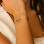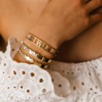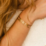 Customize your loved one’s or your Name/ Names, favorite letters and initials, the letters/ numbers and symbols are cut out resting on the wrist with an open area at the end. Made from 18K Gold.