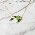 The Olive branch by artist Yasmin Dasouki is 3.5 cm in width, made from Sterling Silver/ Gold Plated and colored Enamel (dark green for leaves, light green for olives and gold for the veins and branch). Necklace is 40 cm unless stated otherwise in additional comments.