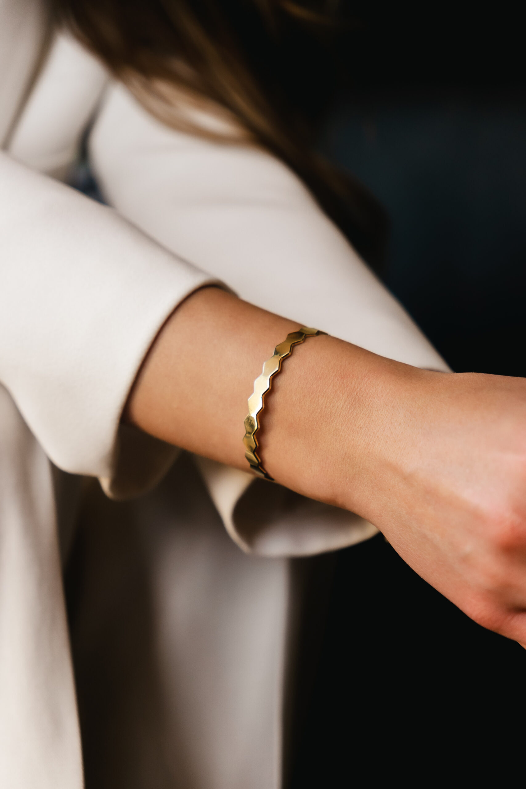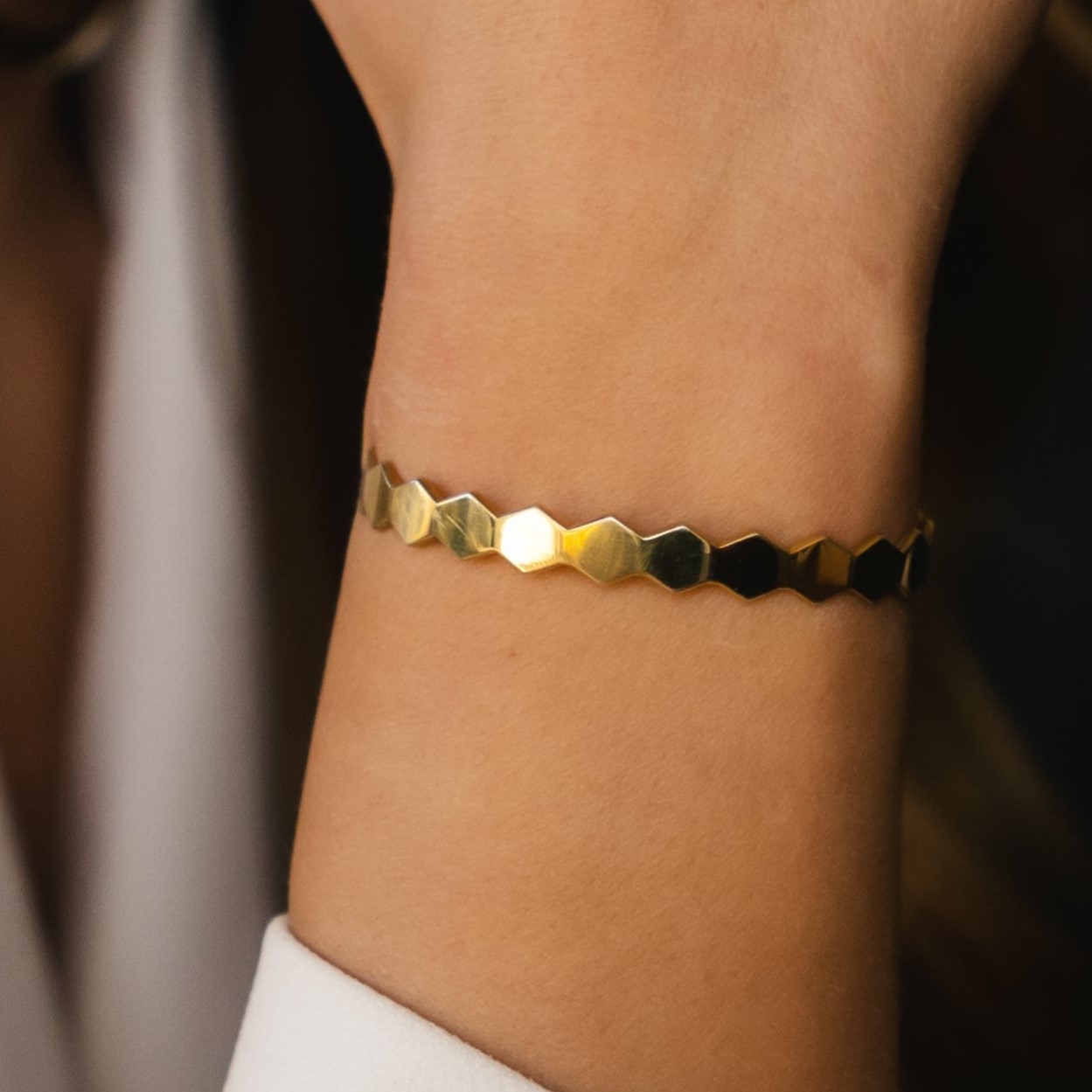 A stunning honeycomb open ended bracelet that gracefully wraps around your wrist.