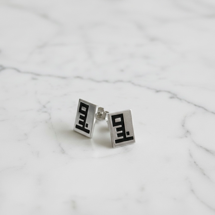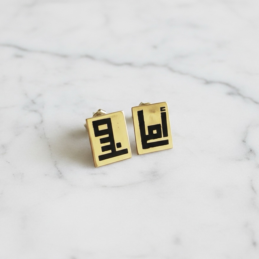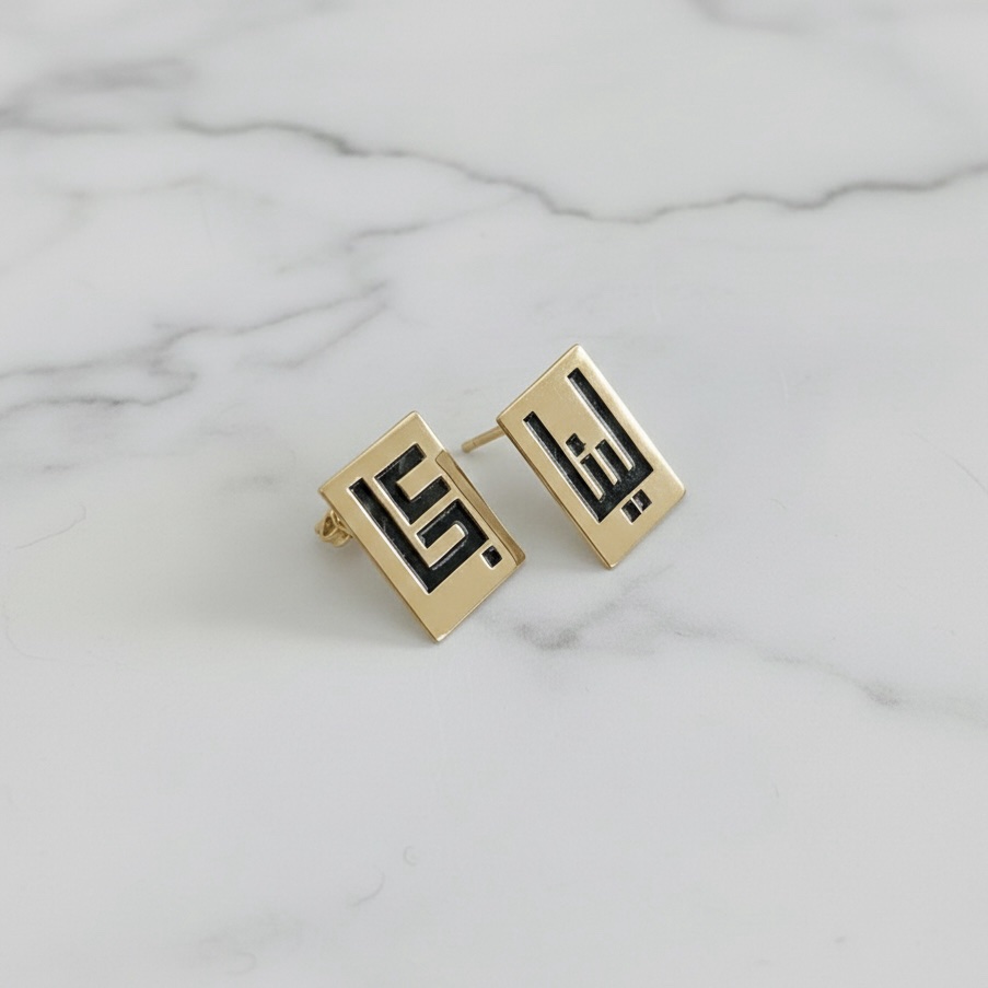 Where tradition meets innovation. These bespoke earrings capture the soul of Kufic calligraphy, transforming meaningful names or powerful words into a custom piece of wearable art. Each pair is uniquely handcrafted and designed by Graphic Calligrapher Hala Qattan.
