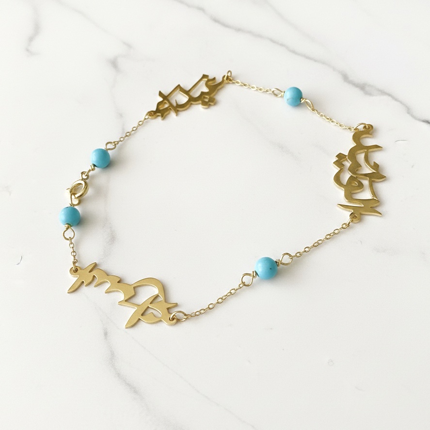 Whether it’s the names of your children, your siblings, or a tribute to your heritage, this bracelet serves as a daily reminder of the loved ones you keep close to your heart. The combination of high-polish gold and the earthy blue of turquoise makes it a versatile statement piece for both daily wear and special occasions.