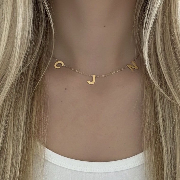 The choker can feature up to 5 or 6 initials to create a unique piece, sized 1-1.2 cm achieving a dainty yet noticeable look, you can choose Arabic or English letters crafted from 18K Gold (Yellow, White or Rose)