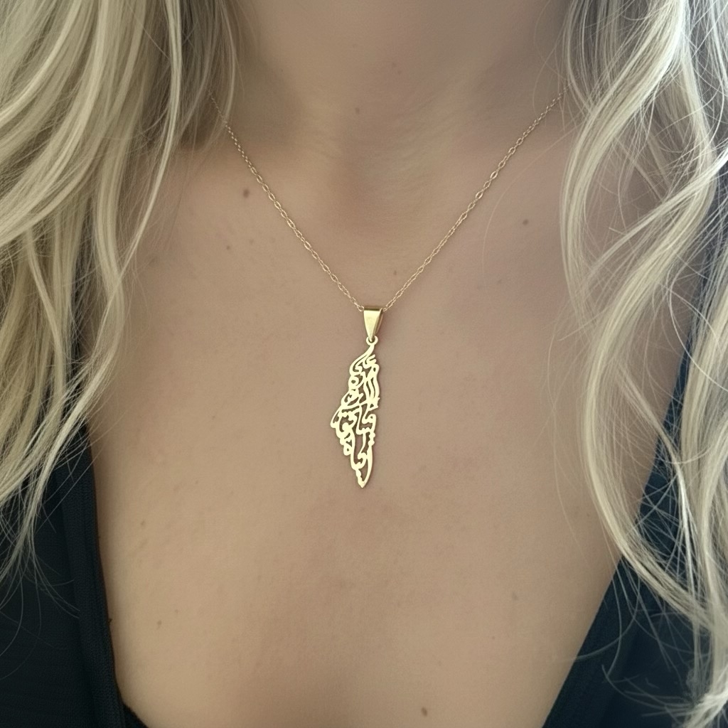 18K gold pendant featuring the Map of Palestine and custom Arabic calligraphy of Mahmoud Darwish’s line: “We have on this land all of that which makes life worth living.”