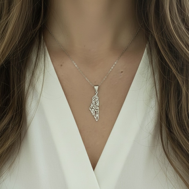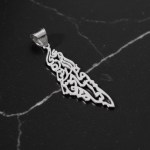 This beautiful pendant design showcases the Map of Palestine overlaid with custom Arabic Calligraphy of a line from Mahmoud Darwish's beloved poem "On This Land." ("We have on this land all of that which makes life worth living").