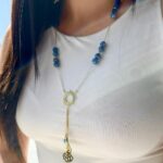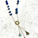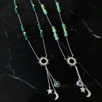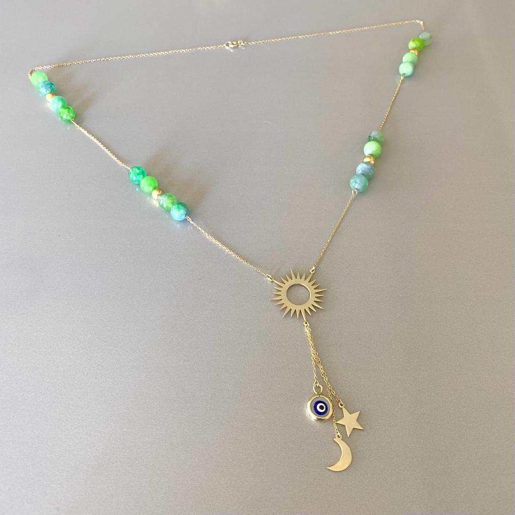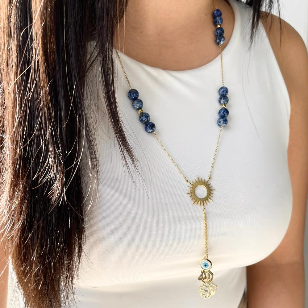 The Royalty Sun Rosary is a long necklace, 55-57 cm in length with 16 stones: Lapis Lazuli (Blue), Malachite (Dark Green), Jade (Light Green), Agate (Neutral or Yellow) or Turquoise-? 8 stones on each side, separated by gold plated balls. Sun in the center 2.3 cm in width and height and 3 customizable charms.