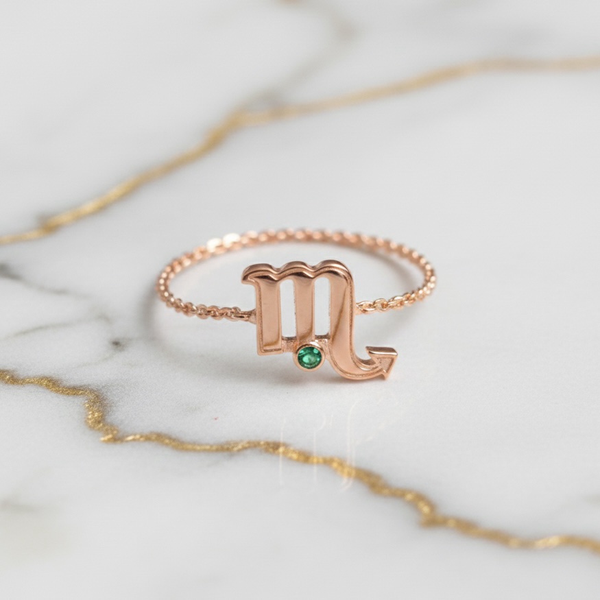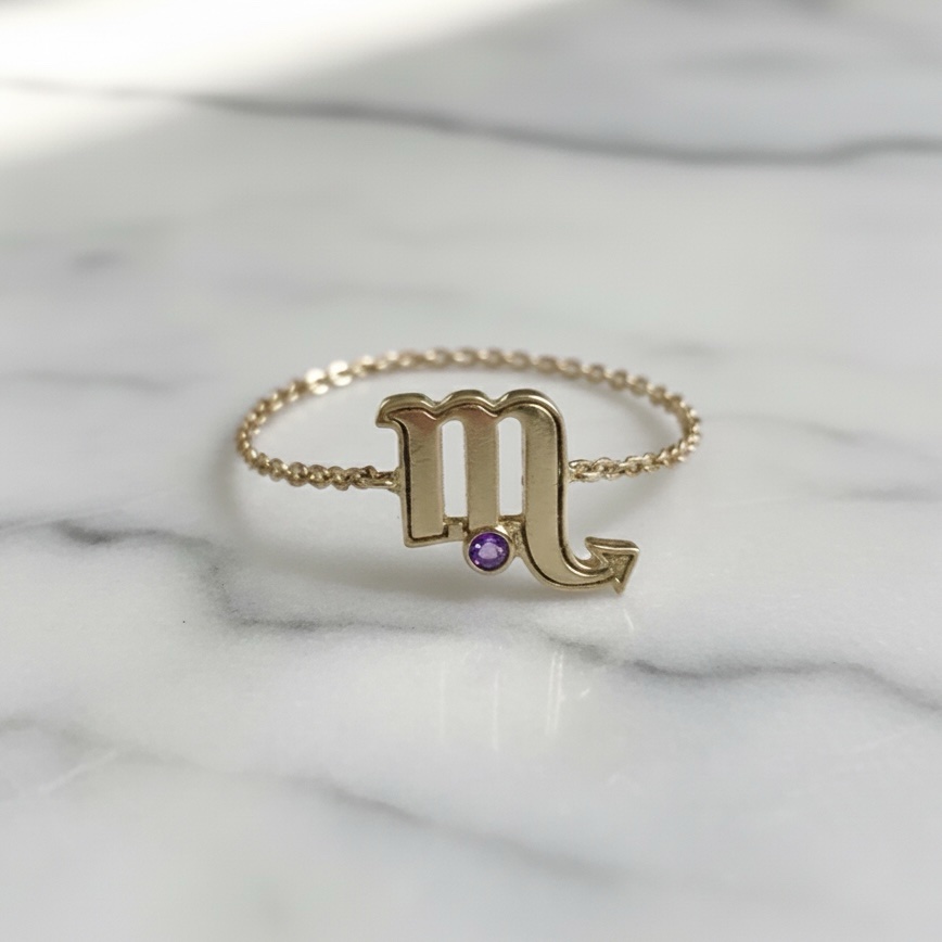 Crafted with 18K Gold and your favorite gemstone, this Horoscope sign chain ring is the perfect way to represent your star sign or gift your favorite Scorpio.