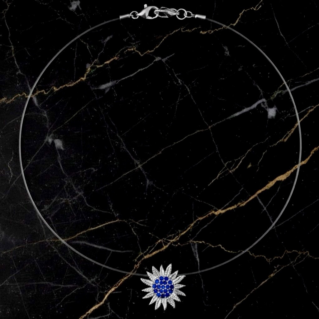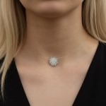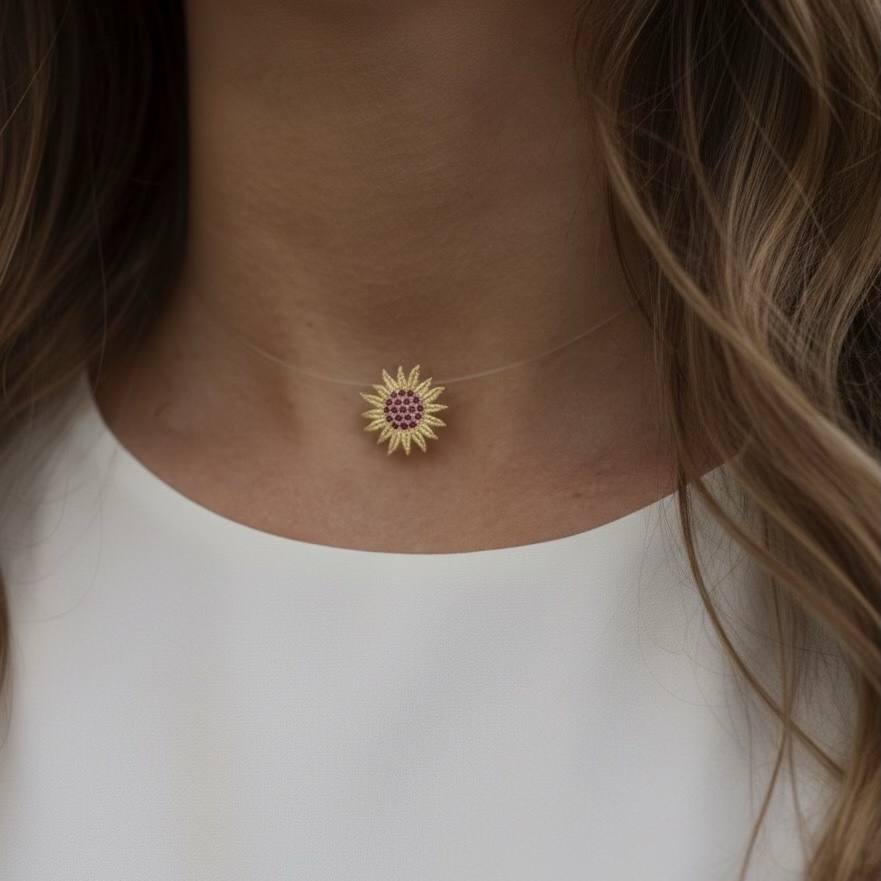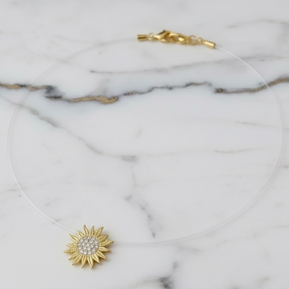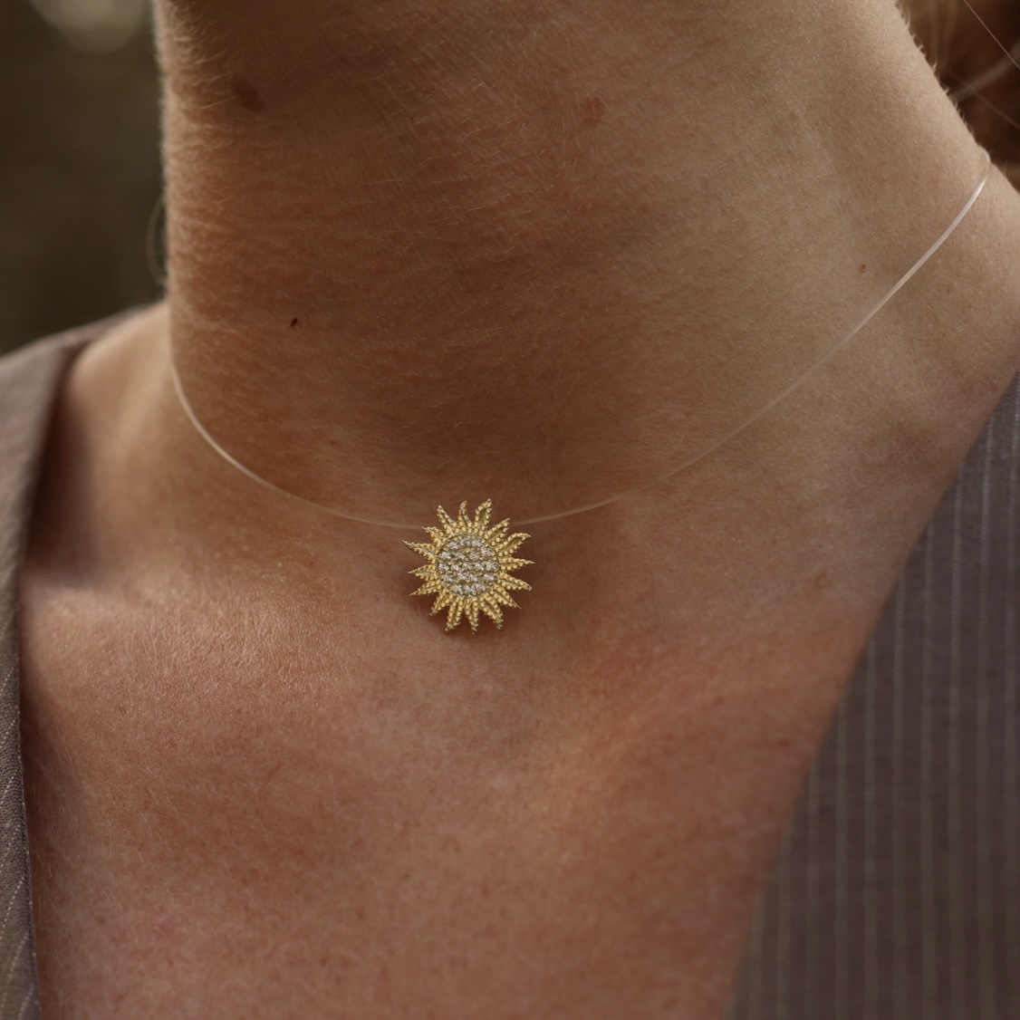 A minimalist piece featuring an 18K Gold sun pendant accented with sparkling gemstones. The sun, a universal symbol of vitality and brilliance, appears to float magically on your neck, suspended by a nearly invisible, high-quality nylon wire and secured with an 18K Gold clasp.